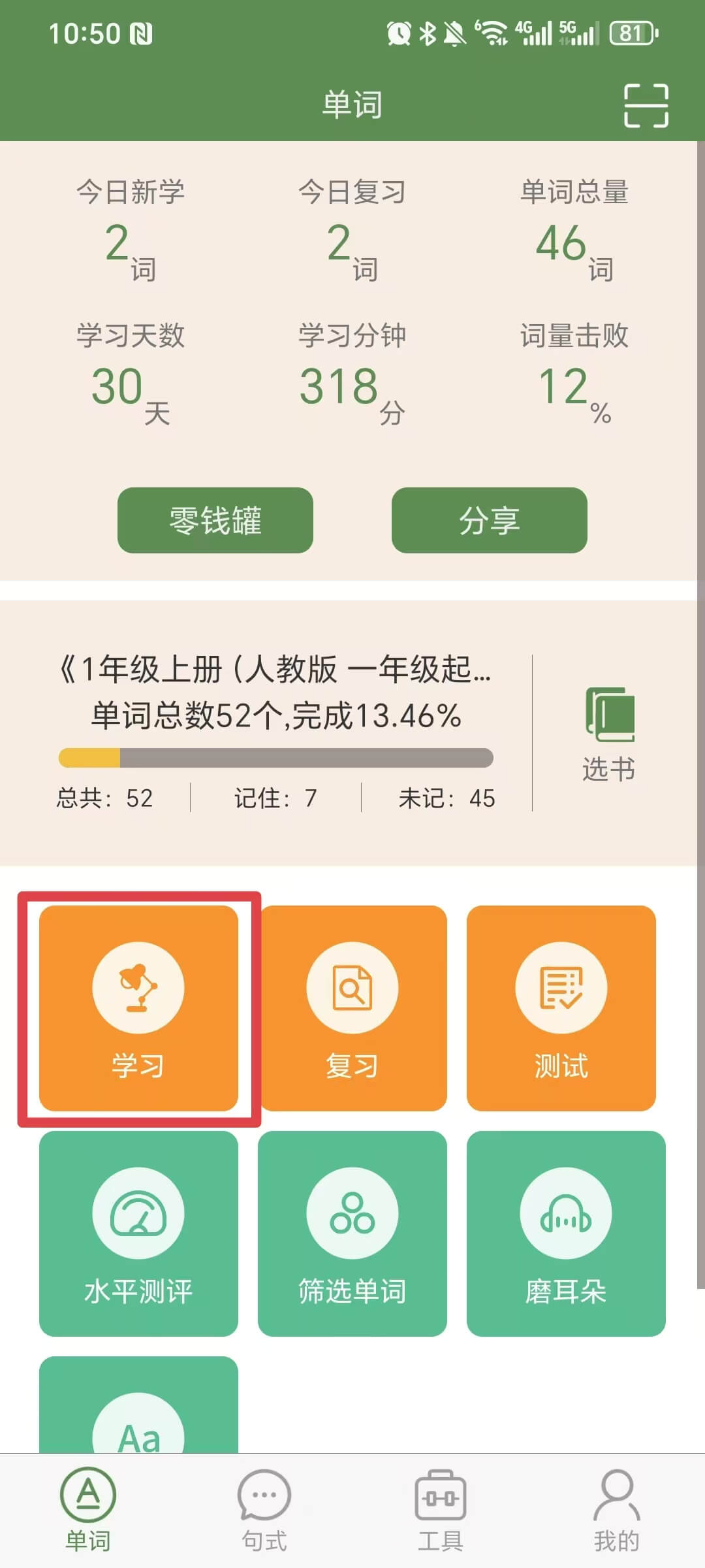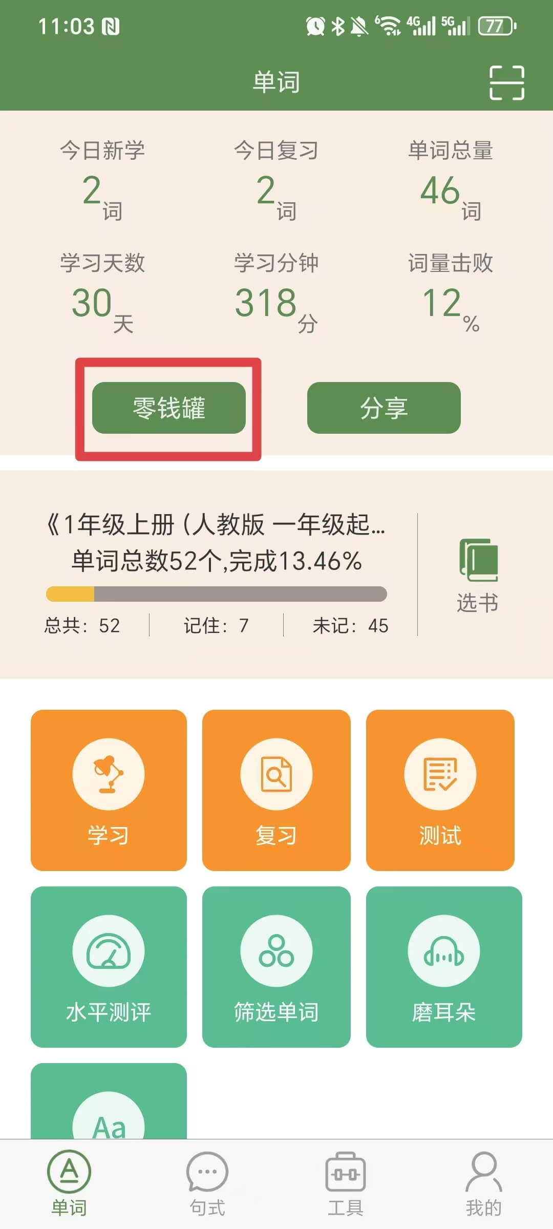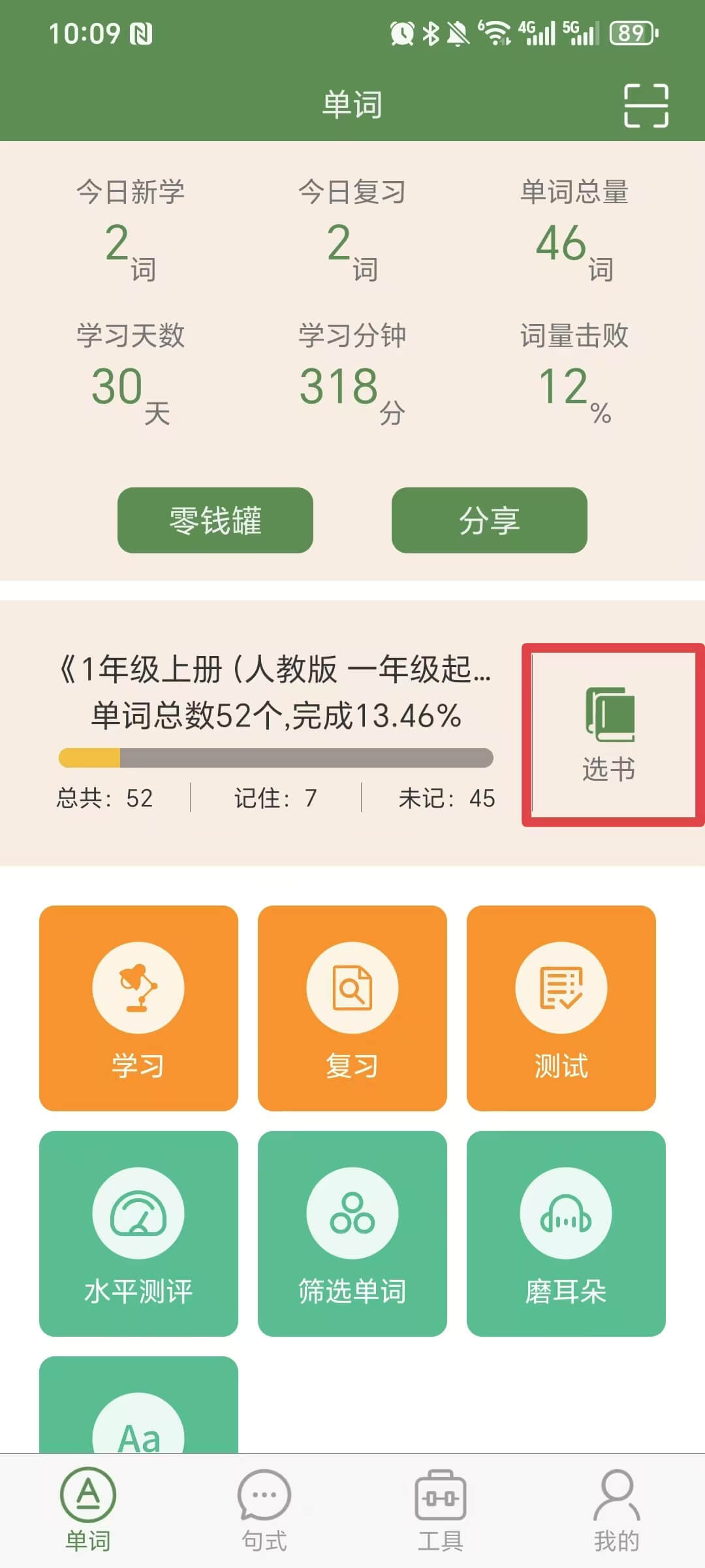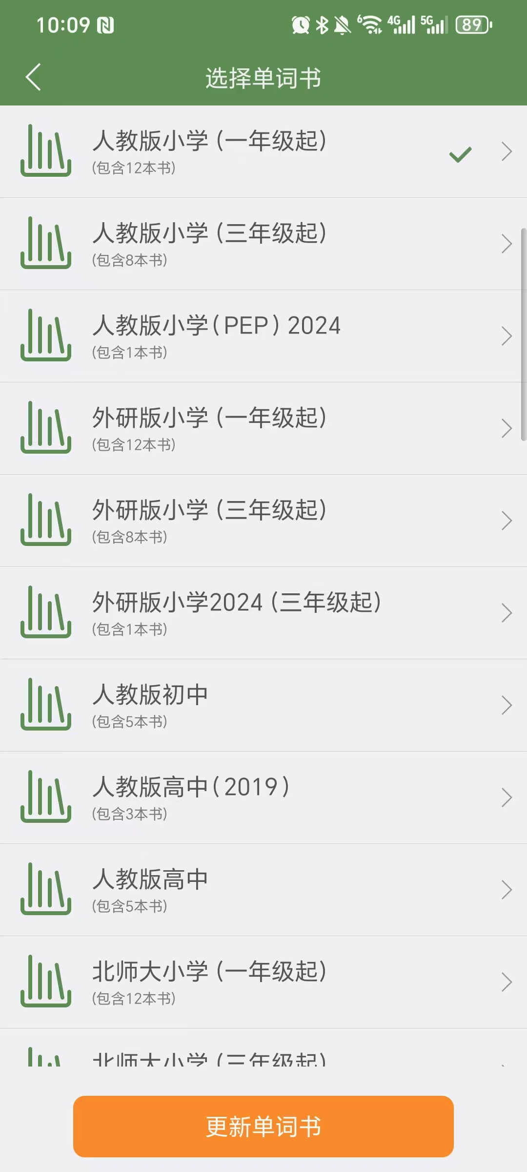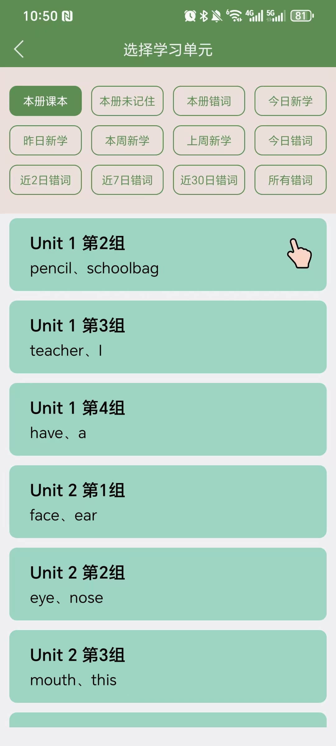 注意:如果是首次体验的小学生,选择“推荐单词书”文件夹中的《小学词汇_T20》。