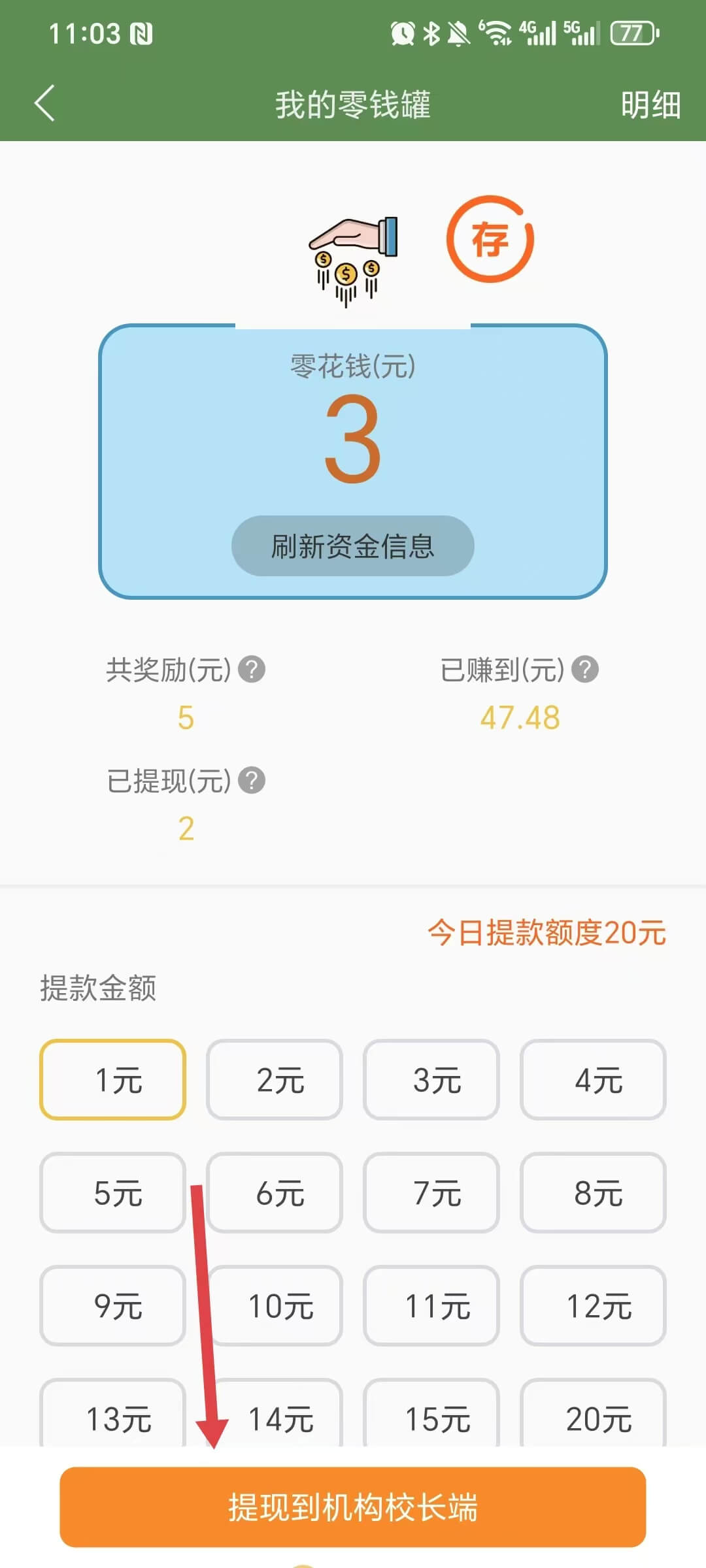 登陆后,在单词界面击【零钱罐】按钮,进入提款页面,选择提款金额,点击【提现到机构校长端】,即可完成提款。