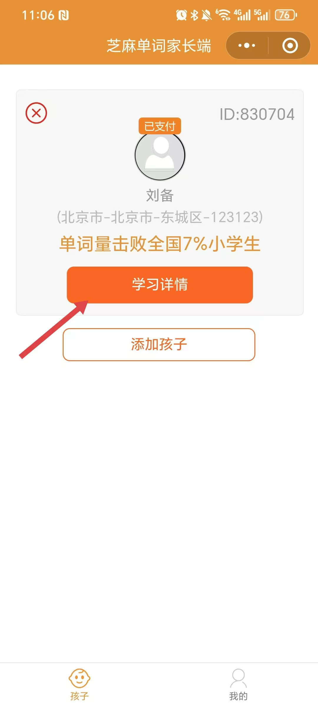 家长首先登录芝麻单词家长端小程序,点击【添加孩子】,输入孩子ID后点击【确定】。点击【学习详情】按钮,即可查看孩子学习数据。