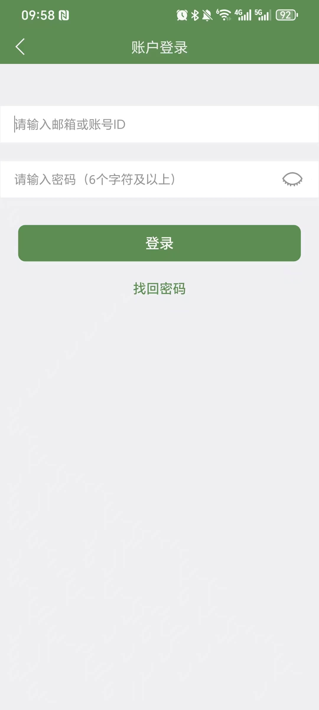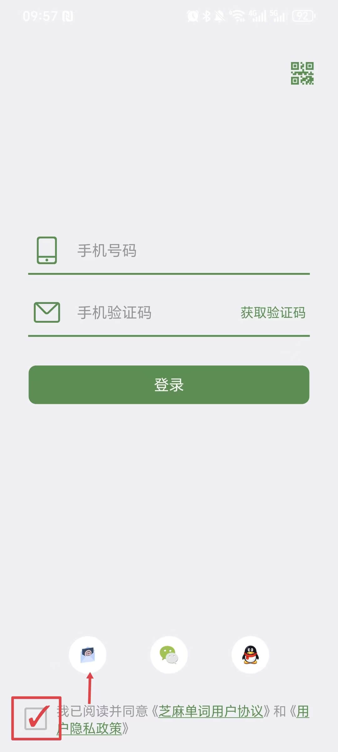 下载安装后打开芝麻单词APP,显示登录界面。首先勾选最下方“阅读并同意用户协议”,再点击上方邮箱图标,输入ID和密码进行登录。
