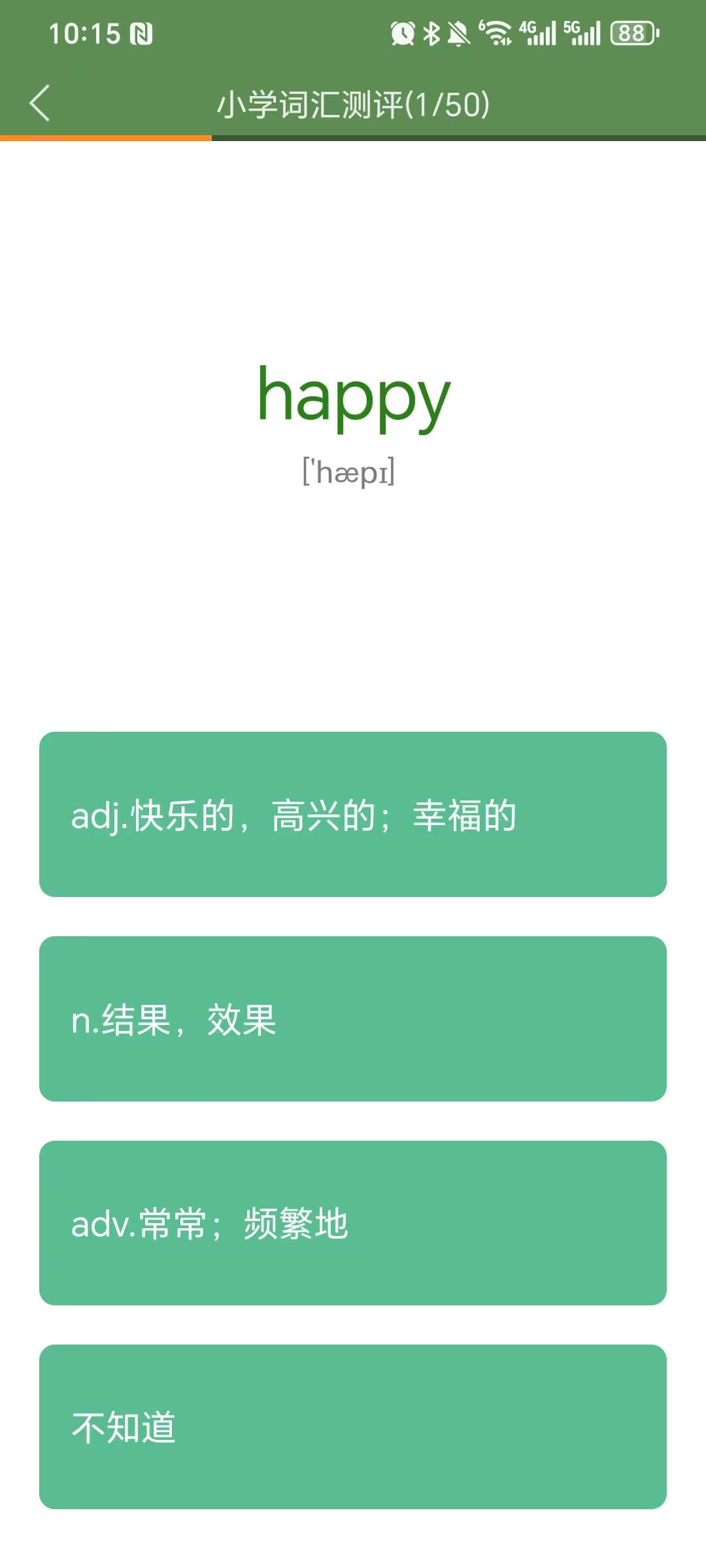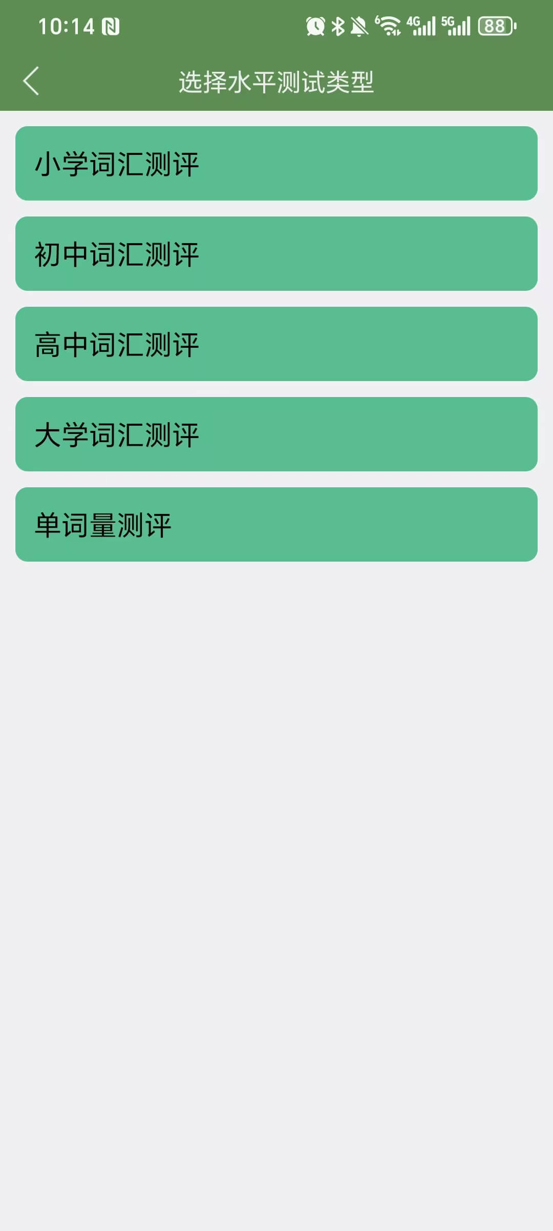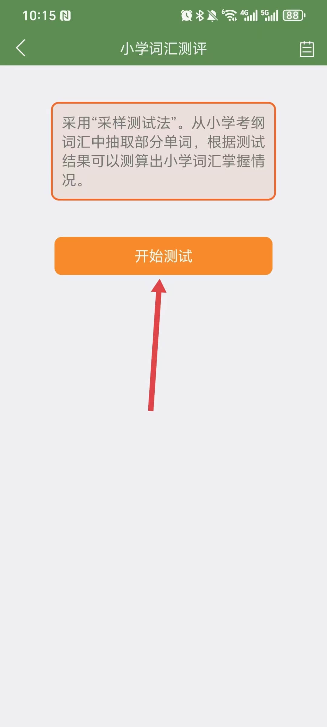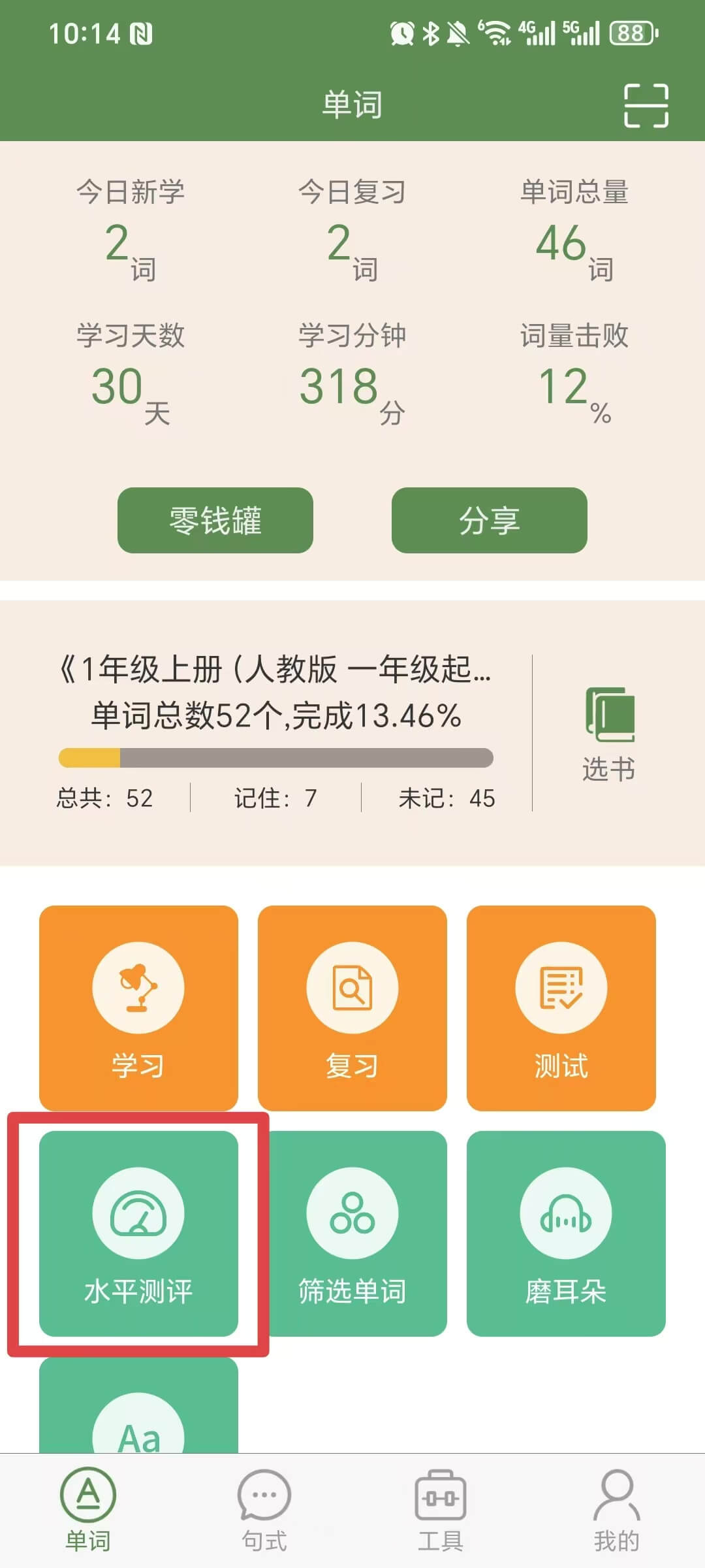 水平测试可以测试出孩子真实的单词量水平。登陆后,点击【水平测试】按钮,选择测试范围,开始测试。