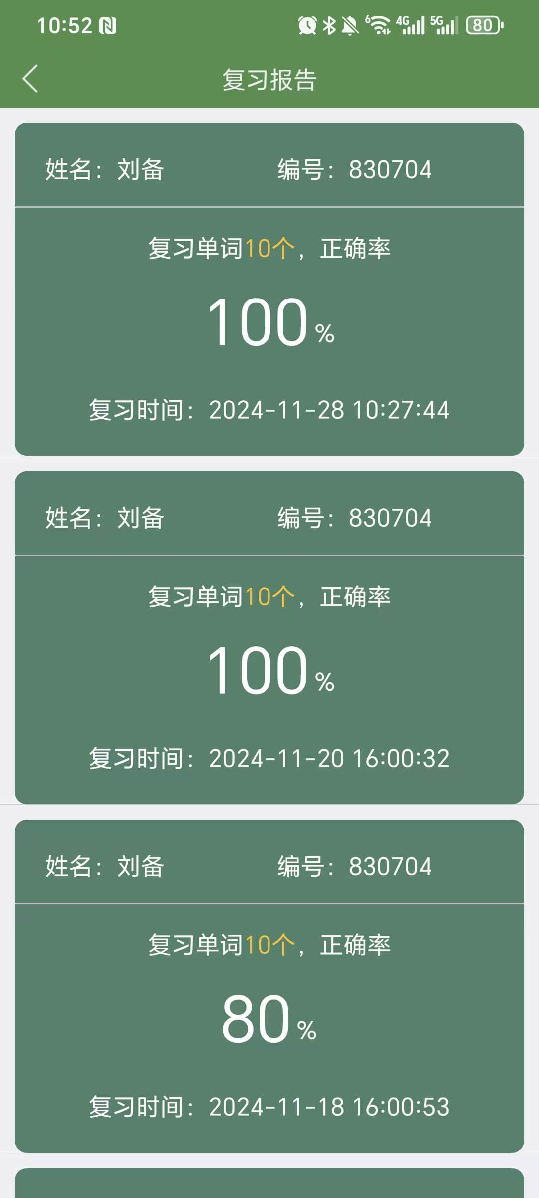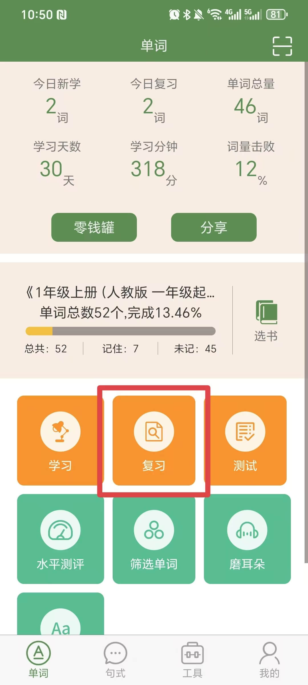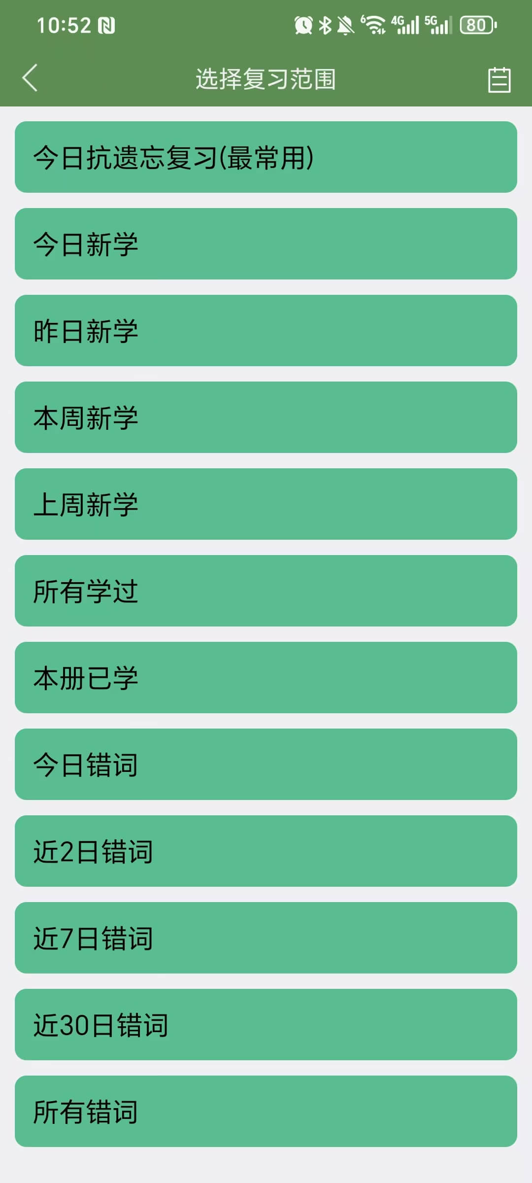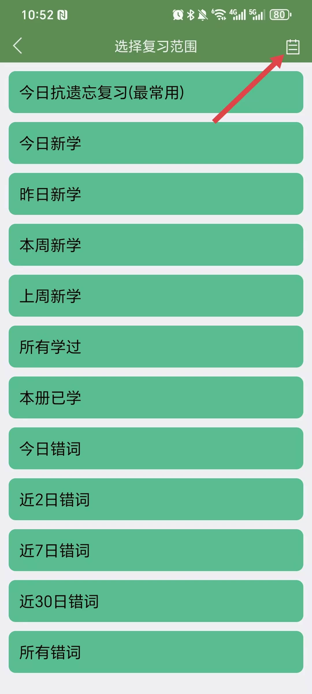 登陆后,在单词界面点击【复习】按钮,选择复习范围进行复习,点击右上角查看复习报告。每次复习完成后,会生成复习报表。