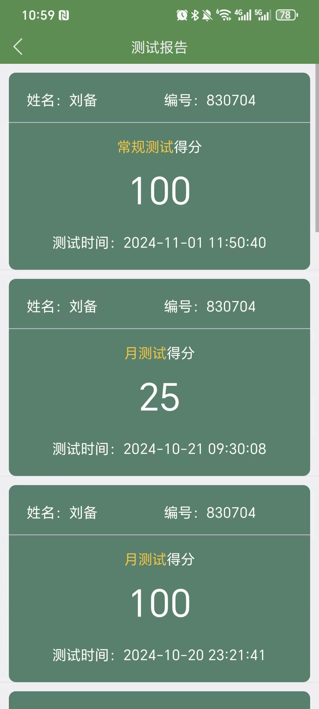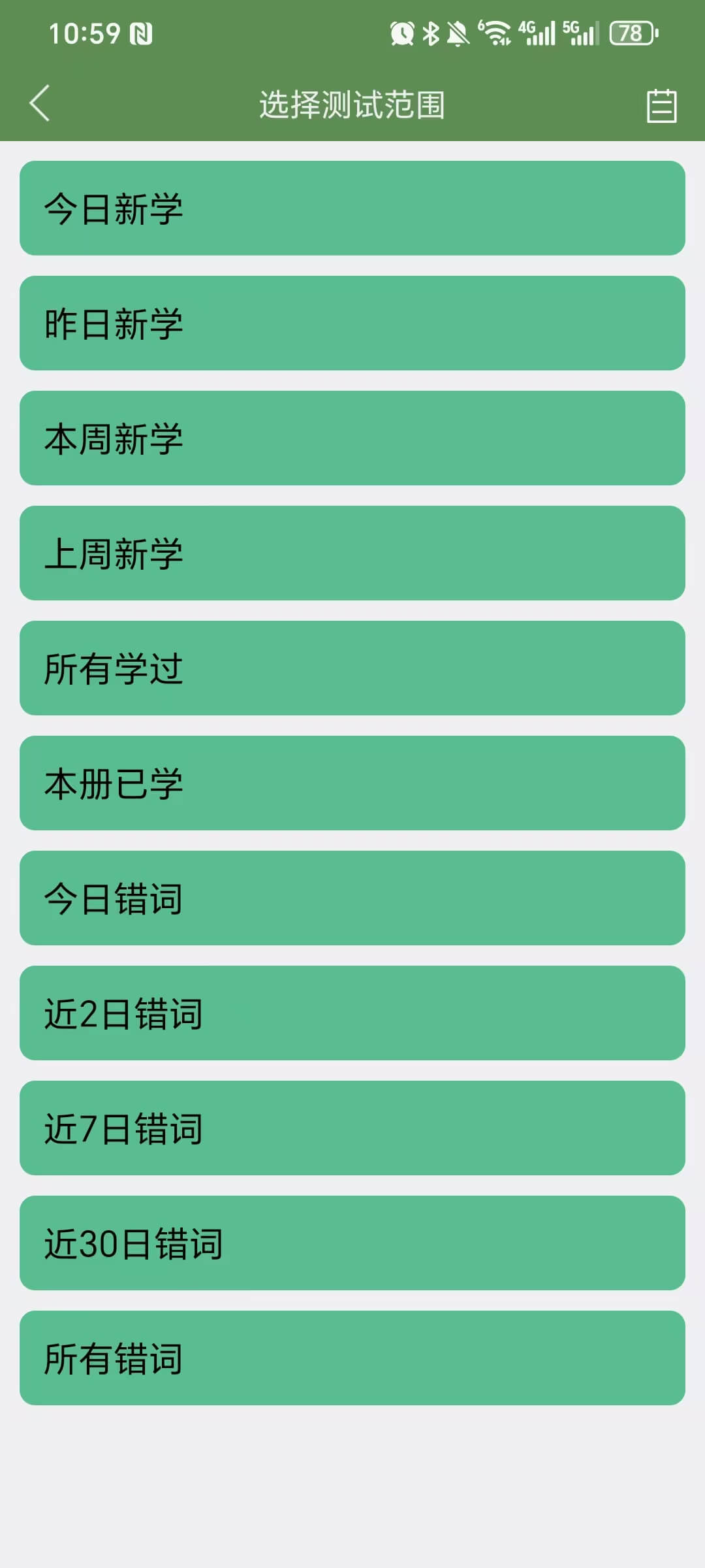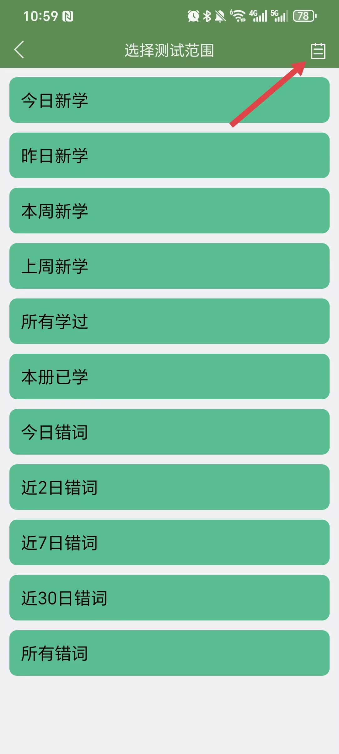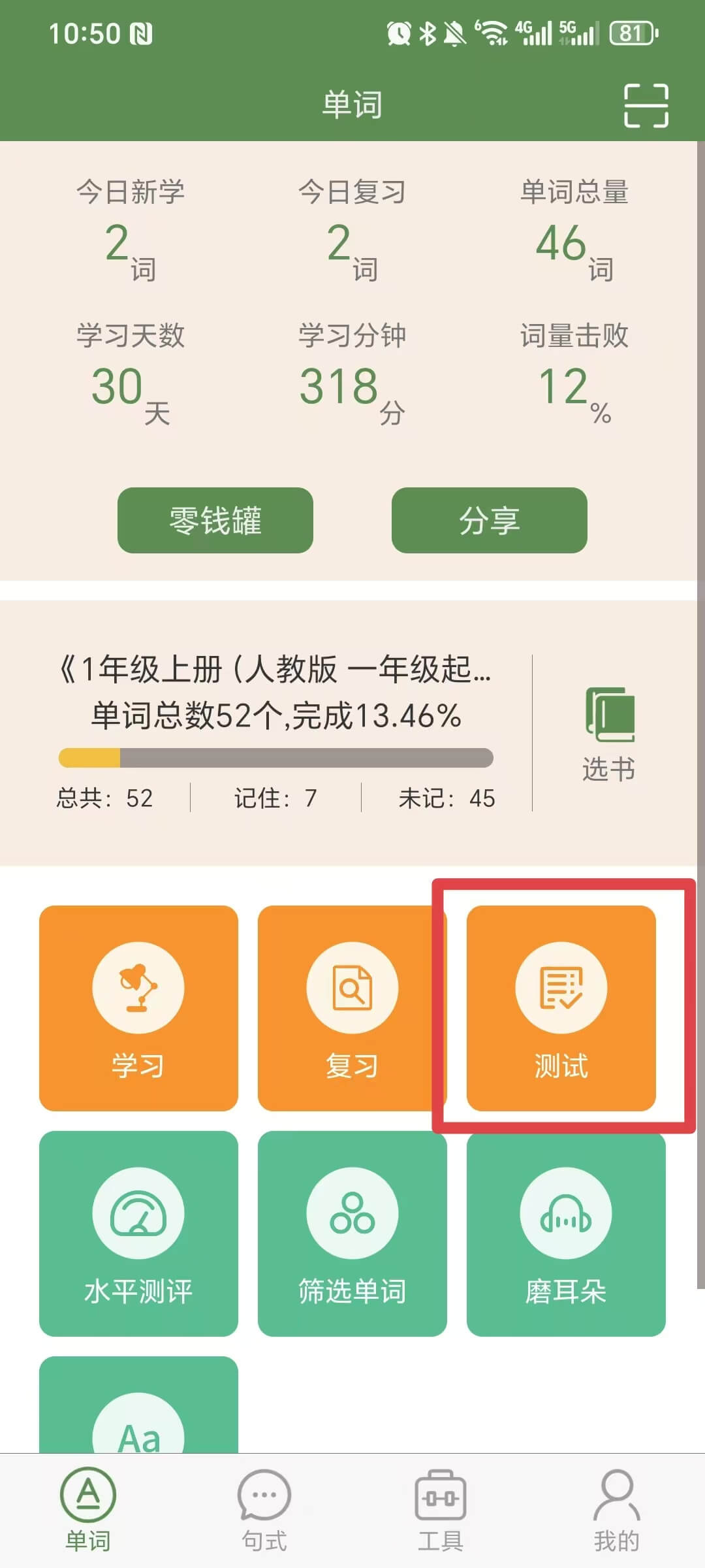 登陆后,在单词界面点击【测试】按钮,选择测试范围进行测试,点击右上角查看测试报告。每次测试完成后,会生成测试报表。